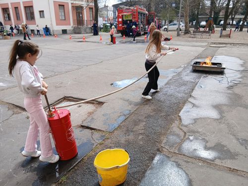 Az ott elhelyezett gyerek tűzoltó ruhákba öltöztek. Két kisméretű tűzoltó tömlőt el kellett vinni a az oltófalhoz. Egy akkumulátorral ellátott oltófal nyílásába kellett vizet juttatniuk puttonyfecskendővel, amint elérte a meghatározott vízszintet, elkezdett villogni és hangot adott a gép.